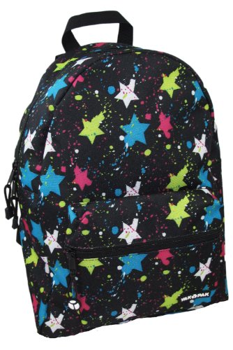 Yak Pak backpack. Black backpack with multi -color paint star splatter pattern. Small front zip pocket with rubber Yak Pak label. Spacious main compartment. Slightly padded back panel and padded shoulder straps. Approx 13" x 16" x 9". Imported.